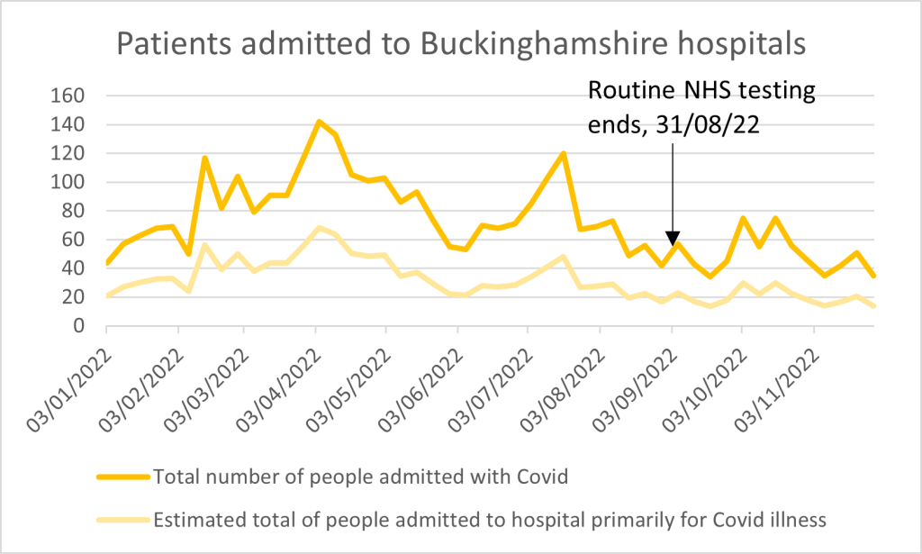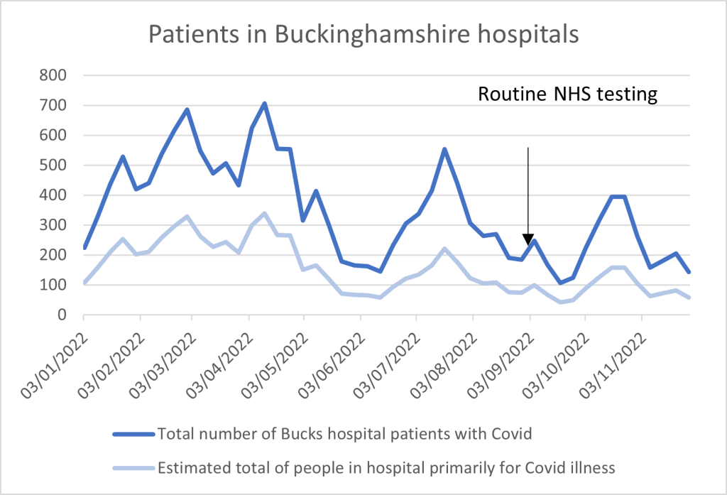 As of May 5, the NHS estimate that a minimum of 40% of patients infected with Covid in hospitals in the SE of England are there primarily because of Covid illness. We have applied this percentage to the total number of patients in Bucks hospitals admitted with Covid to give you a rough idea of how many people are being admitted to hospital because of Covid illness. All these people are likely to be seriously ill with Covid.